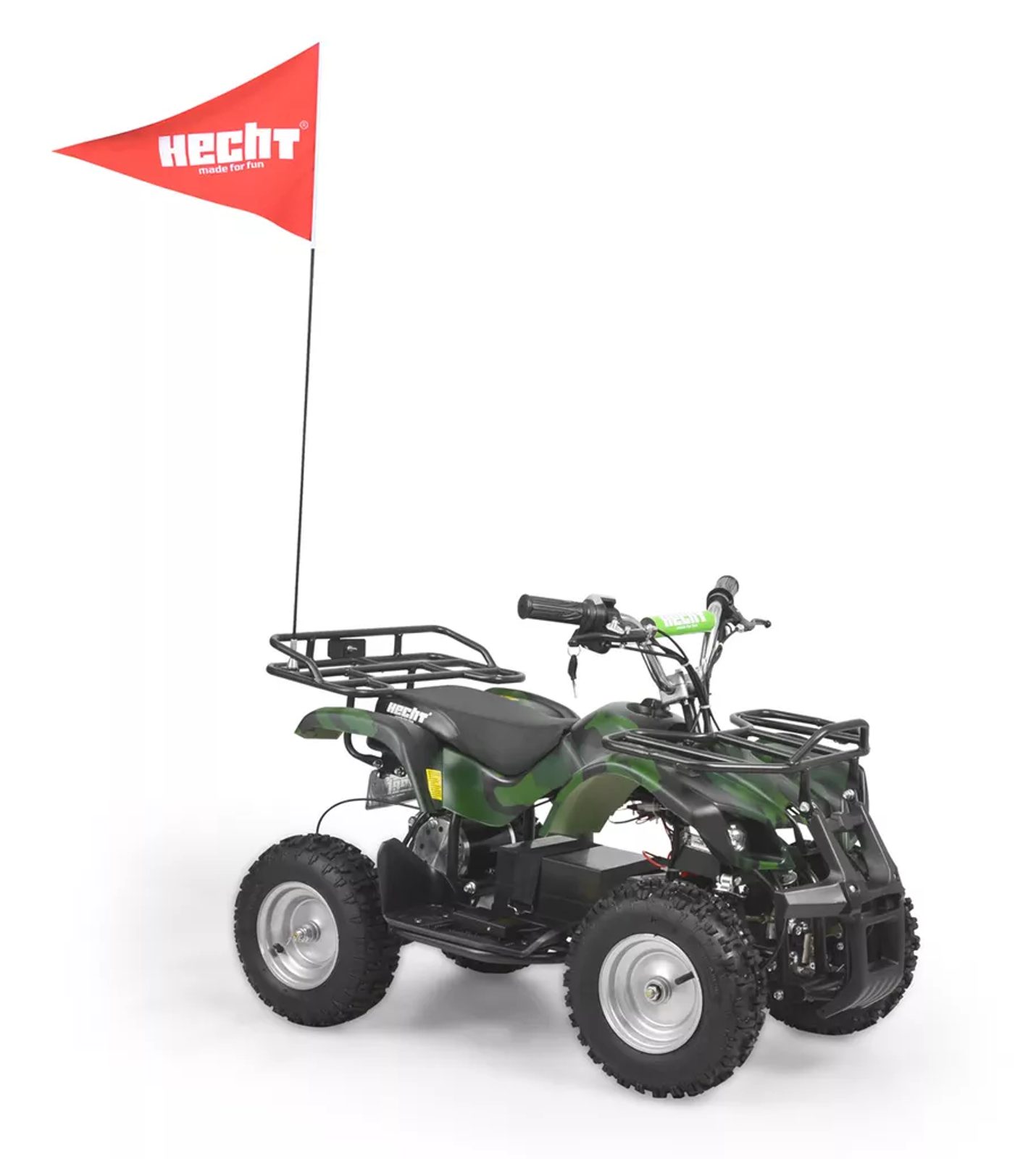 Quad HECHT 56801 akumulatorowy z metalową ramą i z osiami , na których znajdują się duże koła z oponami rzeczywistych rozmiarów. Jako źródło energii jest wykorzystywany akumulator o mocy 36 V / 12 Ah, Napęd zabawki jest napędzany mocą 800 W na tylną oś za pomocą łańcucha. Quad waży 52 kg.