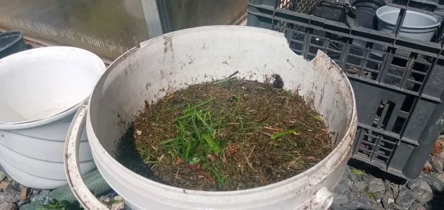 - Wypełnij duży pojemnik (np. wiadro) w około dwóch trzecich materiałem roślinnym. Należy pamiętać, że materiał ulegnie rozkładowi i zmniejszy swoją objętość podczas fermentacji.