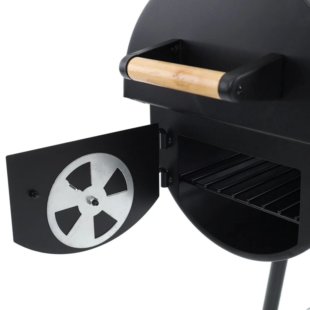 Stylowy ogrodowy grill węglowy z bardzo charakterystycznym designem i solidną konstrukcją. Grill wykonany jest z wysokiej jakości żaroodpornej blachy stalowej o grubości 1 mm, co gwarantuje długą żywotność. W celu ochrony przed szkodliwymi skutkami grillowania całość została pokryta czarną żaroodporną farbą. Wyposażony jest w dwa duże paleniska zamykane od góry, co pozwala na komfortowe grillowanie. Posiada termometr i komin zapewniający bardzo dobrą cyrkulację powietrza, co daje nam możliwość wygodnego wędzenia. Wyposażony jest w dużą wygodną półkę na niezbędne akcesoria do grillowania. Dla jeszcze większego komfortu w obsłudze i atrakcyjnym wyglądzie grill wyposażono w stalowe koła oraz drewniane uchwyty. Jakość materiałów i solidna konstrukcja zapewnia dobrą stabilność ,co pozwala na bezpieczne przemieszczanie się. Grill będzie nie tylko stylowym dodatkiem do każdego ogrodu, ale także świetnym kucharzem twoich ulubionych specjałów z grilla.
