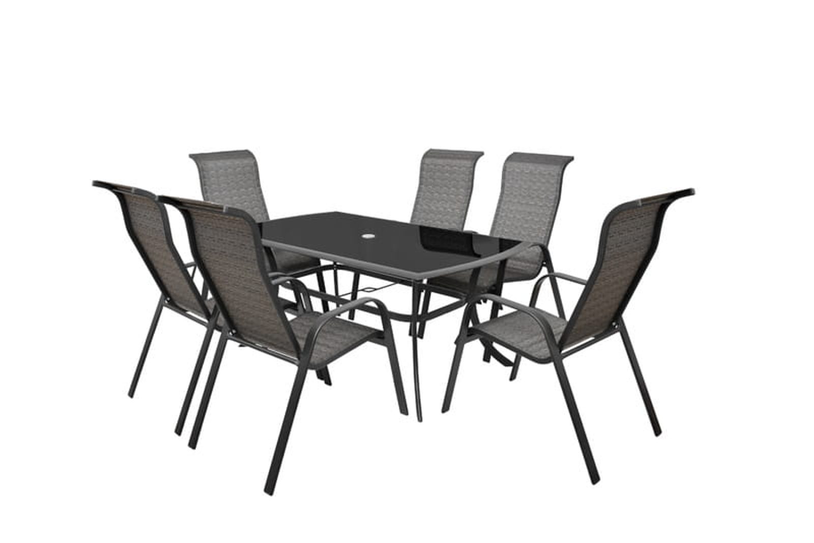 Zestaw sześciu składanych krzeseł oraz stołu z profili aluminiowych. Blat wykonany został z hartowanego czarnego szkła, wyposażony jest w otwór do umieszczenia parasola. Nadaje się do stosowania zarówno wewnątrz pomieszczeń jak i na zewnątrz w wilgotnych warunkach. Dla wydłużenia żywotności, nie zalecamy pozostawiać zestawu w miejscu narażonym na ciągłe działanie czynników atmosferycznych.
