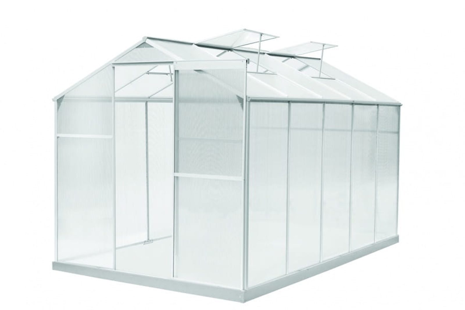 Szklarnia ogrodowa o powierzchni 5,98 m2, wymiary 311 x 190 x 195 cm, rama aluminiowa 1,2 mm, wypełnienie 4mm poliwęglan z filtrem UV, łączenia ze stali galwanizowanej, PODSTAWA GRATIS Pełny opis ▼